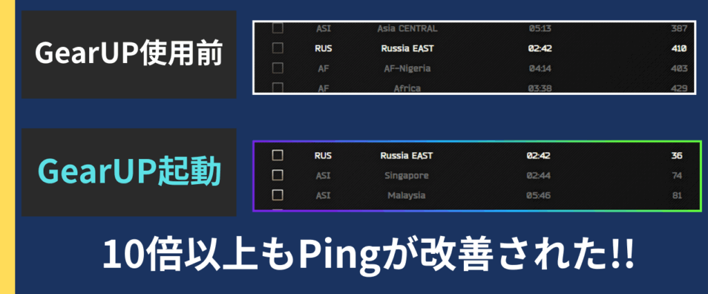 しかし、GearUPを使用したところPingは約36まで改善されました。