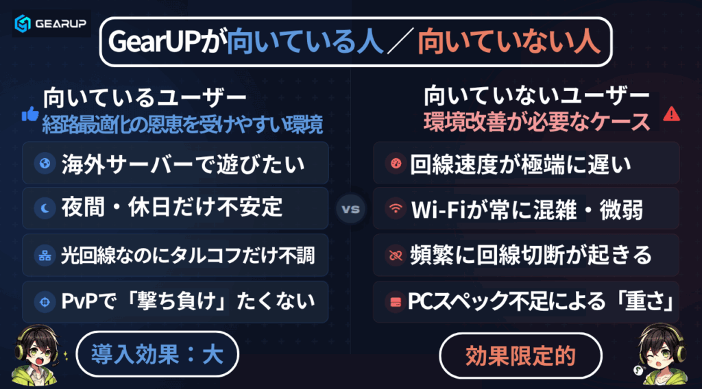 一方で、GearUPの効果が出にくい、あるいは別の対策が先に必要な環境もあります。以下のようなケースでは、GearUPよりも回線改善が優先です。
