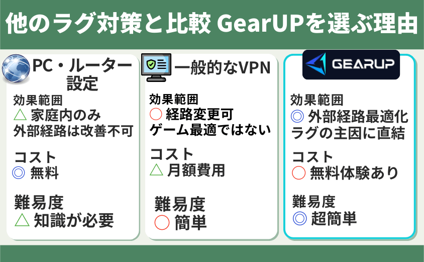 他のラグ対策と比較:GearUPを選ぶ理由