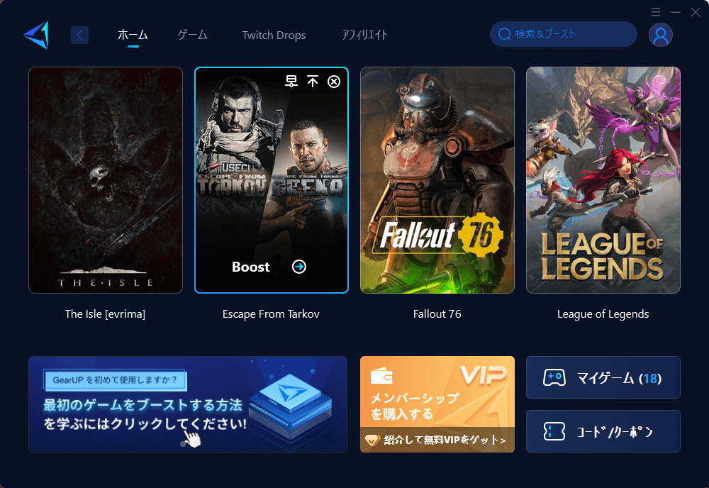 アプリ起動後、ゲーム一覧から「Escape from Tarkov」を選びます。あとはBoostスイッチをオンにするだけで最適化が開始されます。
