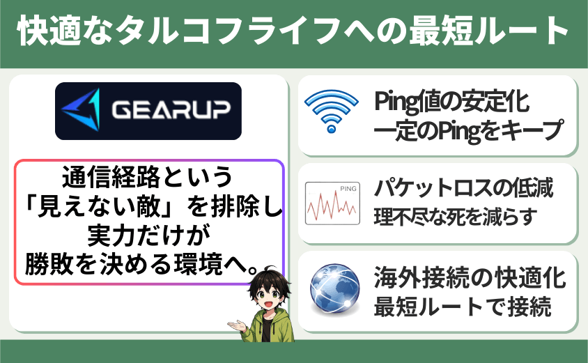 タルコフのラグ対策には複数の方法がありますが、その中でもGearUPは即効性と安定性の両方を期待できる点が特徴です。