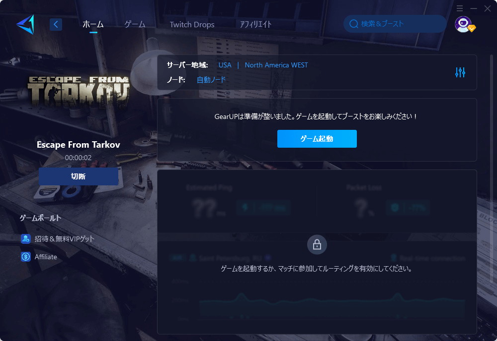 タルコフは海外サーバーにつながる場面も多いため、GearUPの経路最適化の恩恵を受けやすいゲームです。