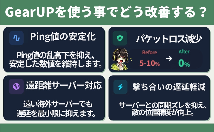 GearUPは、オンラインゲームの通信経路を最適化し、遅延やパケットロスを減らすための専用ツールです。特にFPSやMMOなど通信負荷が大きいタイトルで効果を発揮します。